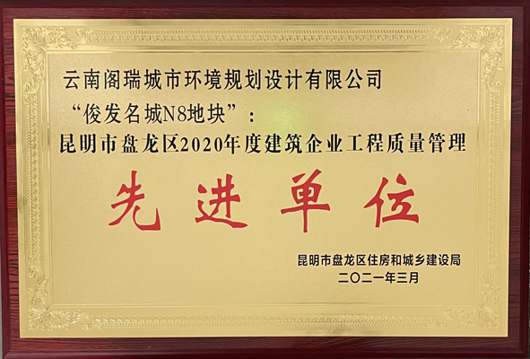 2020年度昆明市盤龍區工程質量管理先進單位(俊發名城N8地塊)