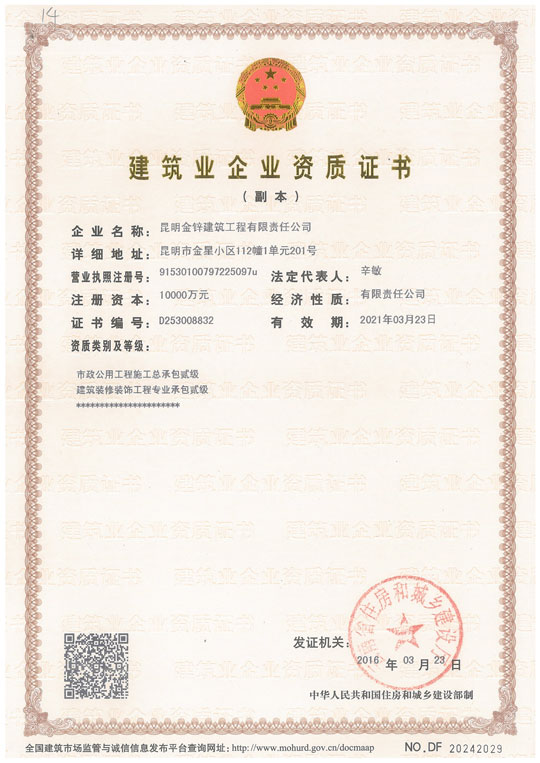 金鋅市政總承包一級(jí)資質(zhì)證書正本