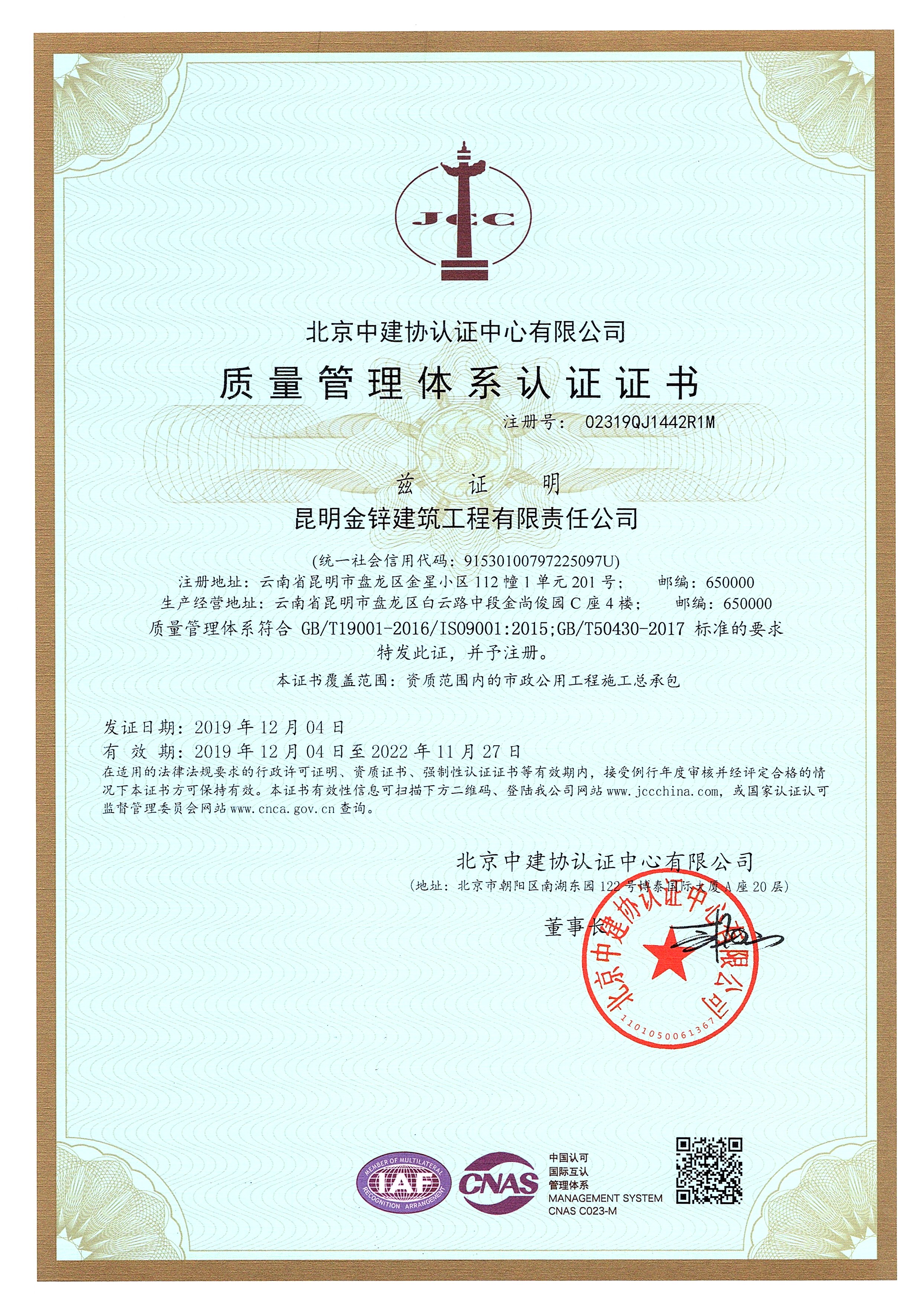 【金鋅市政】質(zhì)量管理體系認(rèn)證證書(正本)